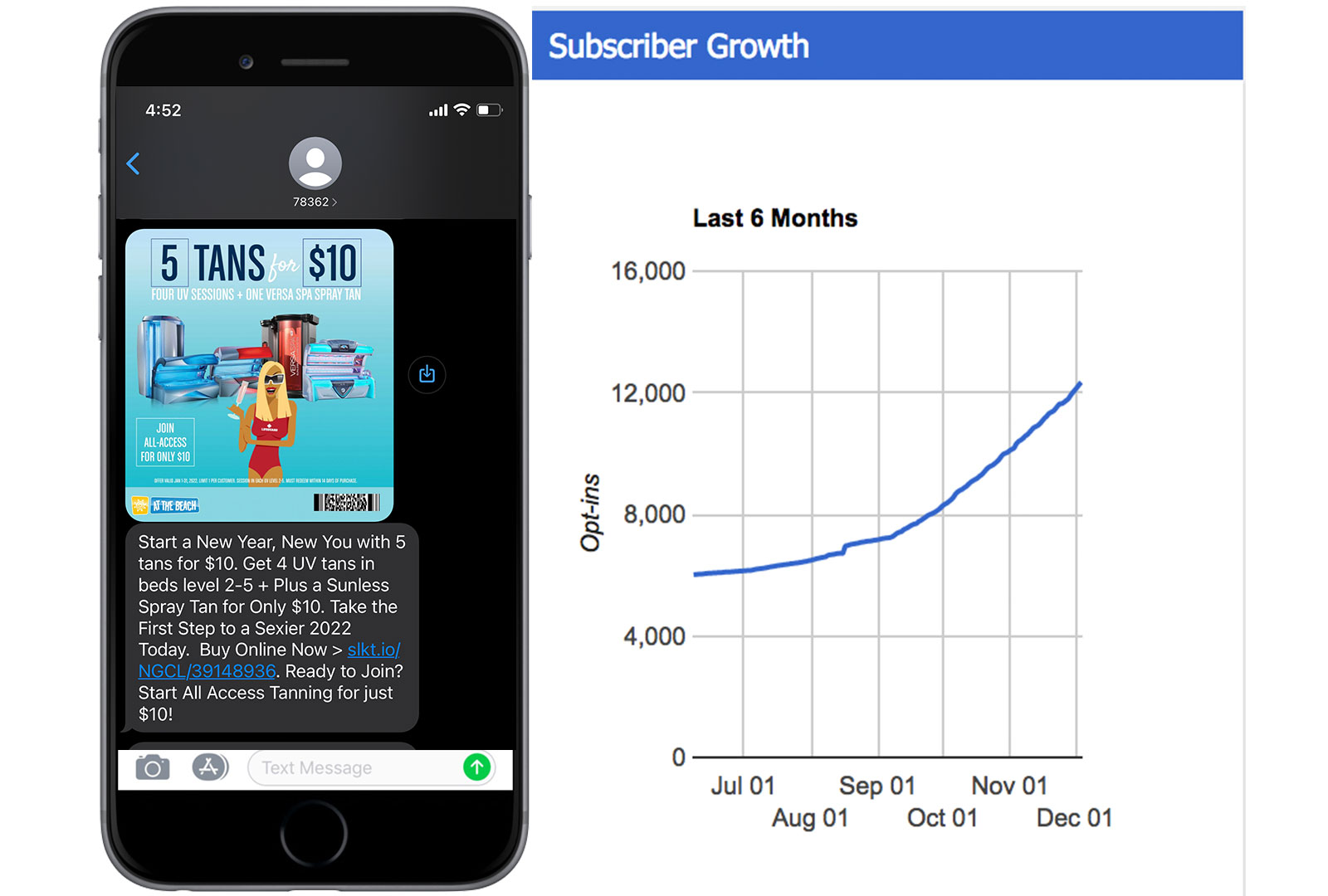 When I first started consulting with At the Beach, there was no SMS marketing in place. The owner and I immediately launched a campaign to get existing customers in the program as well as make it a standard for all new customers. From it’s inception to the sale of the company, the program grew to nearly 100,000 subscribers (the chart to the left shows the rapid growth in the first 6 months). It was a major component in achieving year-over-year sales growth.